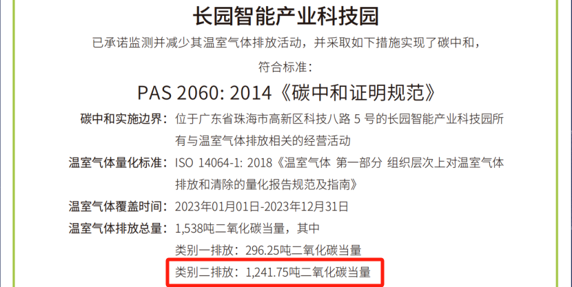 本次園區碳中和的實施,由長園科技集團旗下子公司長園綜合能源(深圳)有限公司(簡稱“長園綜能”)根據國際標準ISO 14064-1:2018《溫室氣體-第一部分 組織層面上溫室氣體排放與清除量化及報告規范》對園區類別1、類別2溫室氣體排放量進行了核算并出具核算報告,由中國合格評定國家認可委員會(CNAS)授權的第三方核證機構華測檢測(CTI),按照ISO 14064-3《溫室氣體聲明審定與核查的規范及指南》對核算報告進行了核查,并根據PAS 2060《碳中和證明規范》對碳中和結果進行了認定。